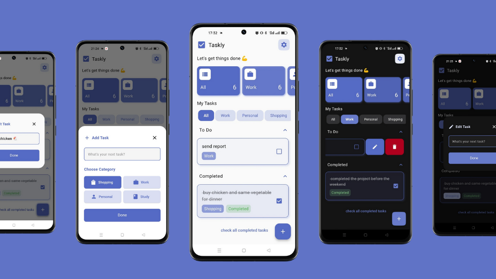 - Settings Screen (Theme Switch, Clear All Tasks, About Taskly)